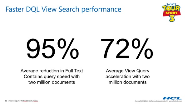 Now, even after that improvement, we have added Full Text searching, long known to be the fastest way to find a Lotus Note, let alone a set of them. The 95% number applies to the 2.8 second result, so, a query term that took 10 seconds to service using a view in V10 will take around 0.14 seconds using the new CONTAINS operator in V11. Yes, that fast.