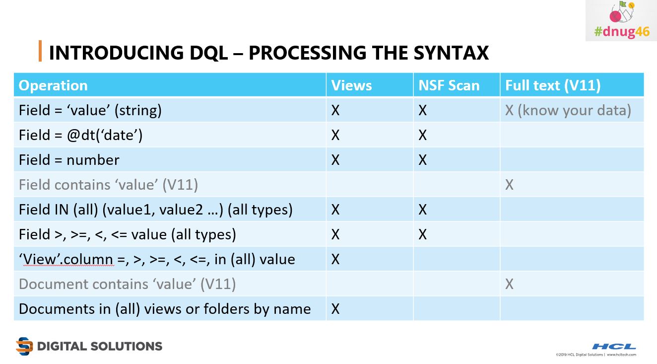 The Andrews – Manby and Davis – presented the Domino AppDev work we’ve done and are doing for V11 and V12 this morning. There were several slides on DQL, one of which cited some performance gains in V11: